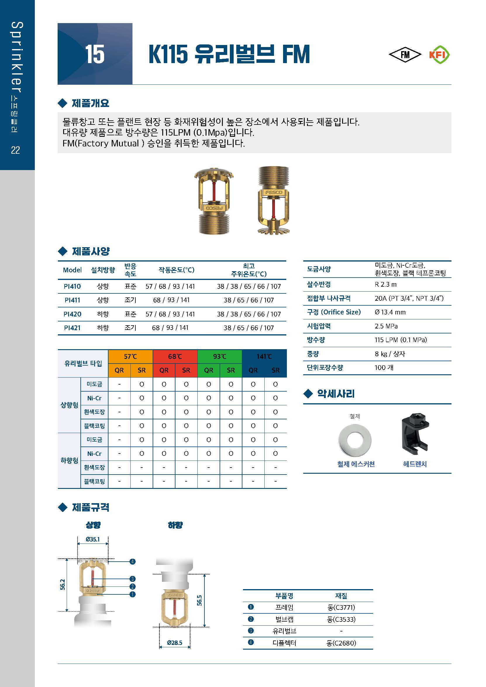 물류창고 또는 플랜트 현장 등 화재위험성이 높은 장소에 사용되는 제품입니다. 대유량 제품으로 방수량은 115 Liter/min(0.1 MPa)입니다. FM 인증을 취득한 제품입니다.