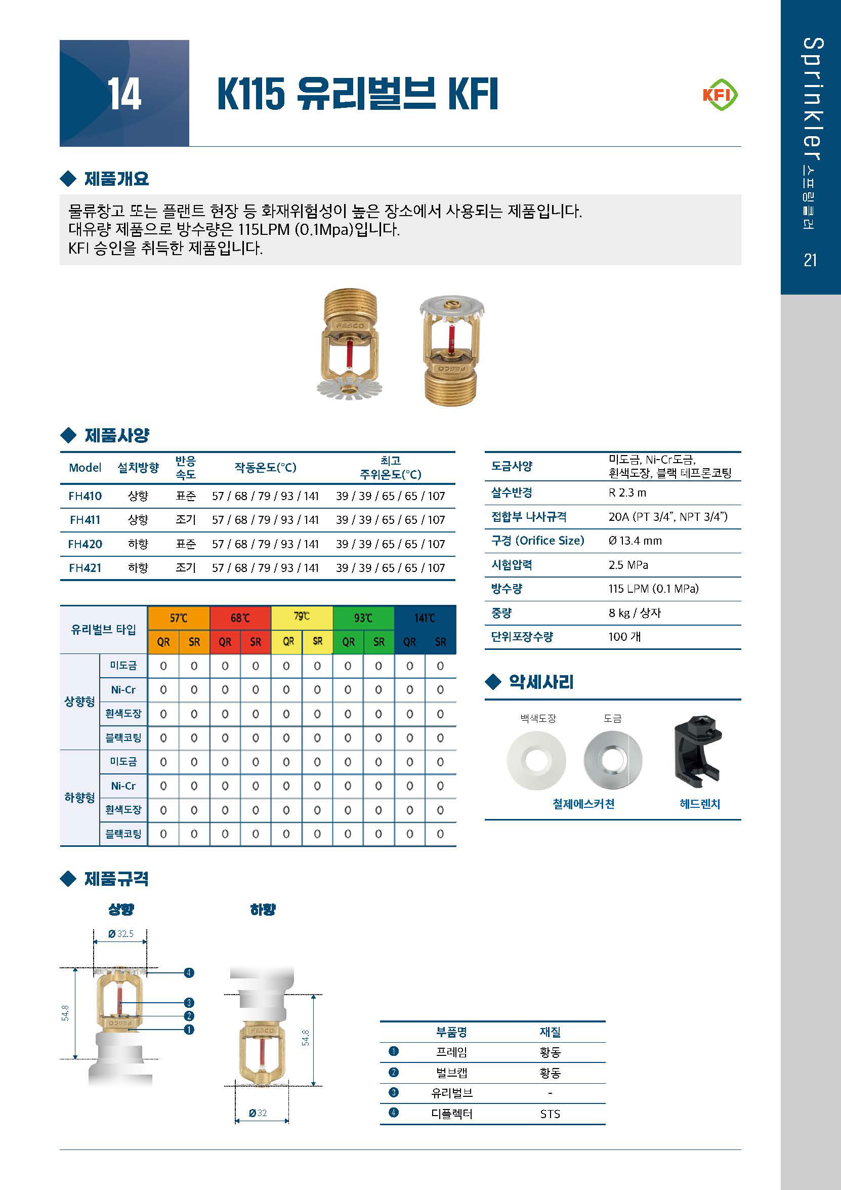 물류창고 또는 플랜트 현장 등 화재위험성이 높은 장소에 사용되는 제품입니다. 대유량 제품으로 방수량은 115 Liter/min(0.1 MPa)입니다.