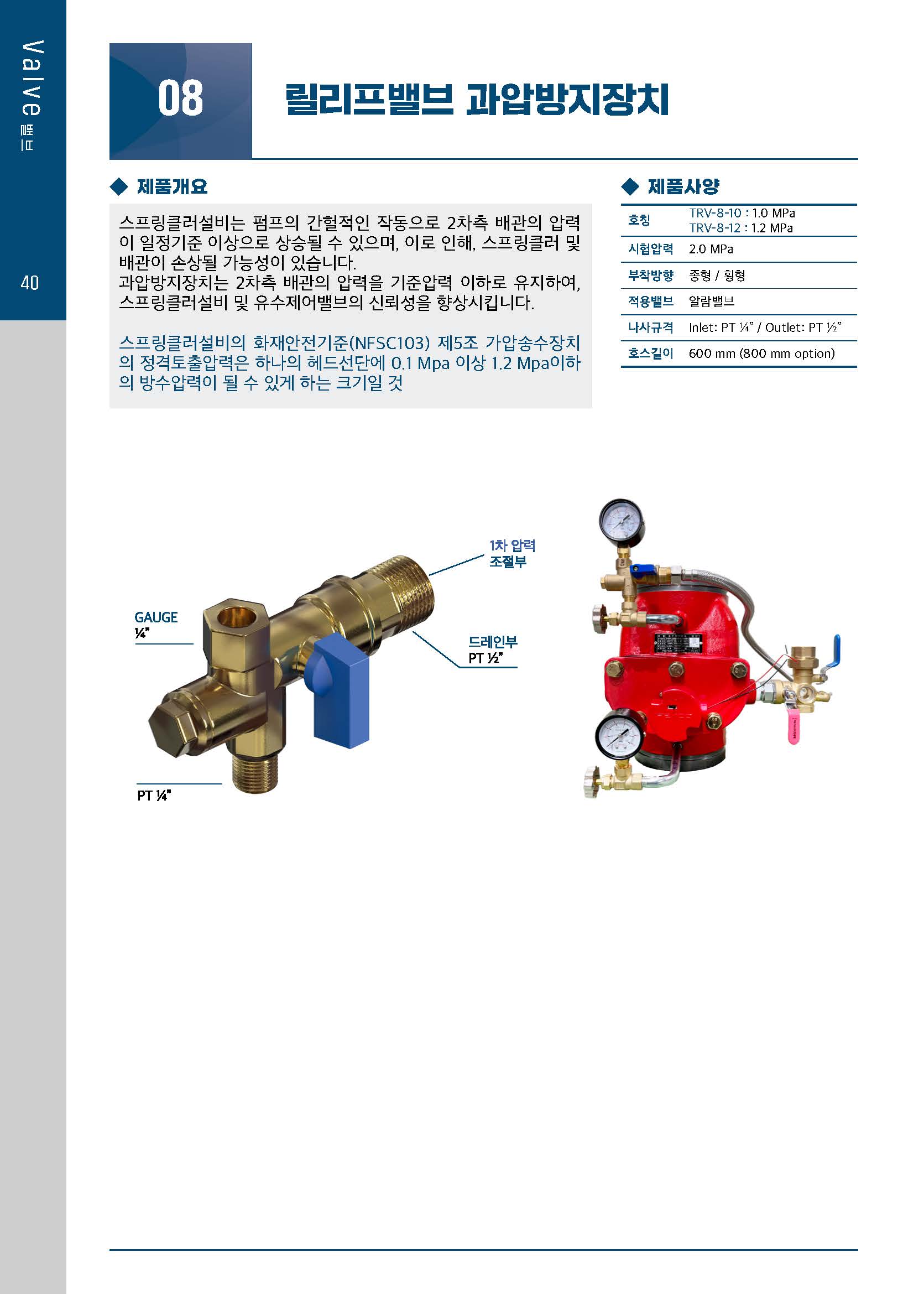 과압방지장치는 2차측 배관의 압력을 기준압력 이하로 유지하여, 스프링클러설비 및 유수제어밸브의 신뢰성을 향상시킵니다.